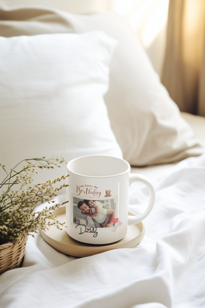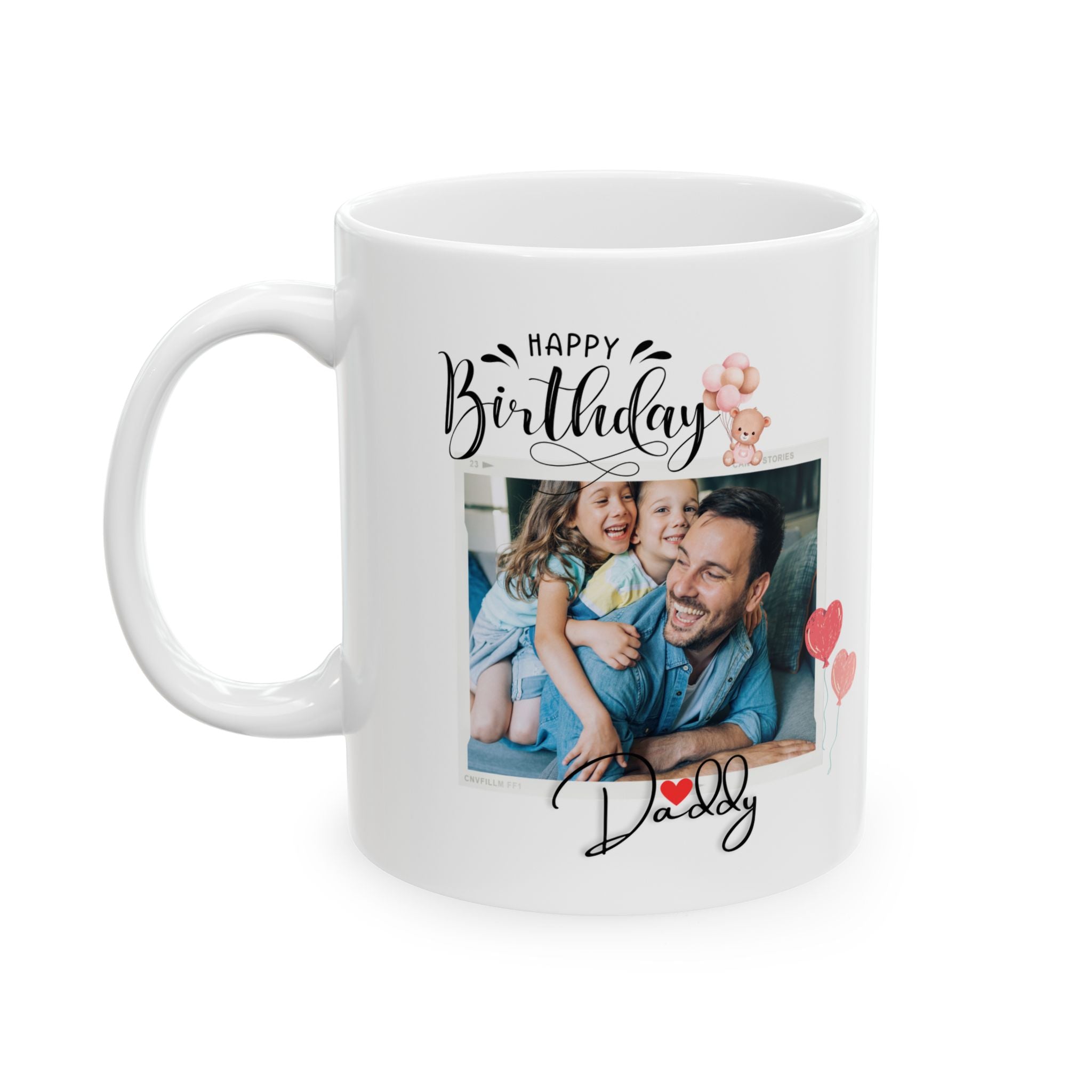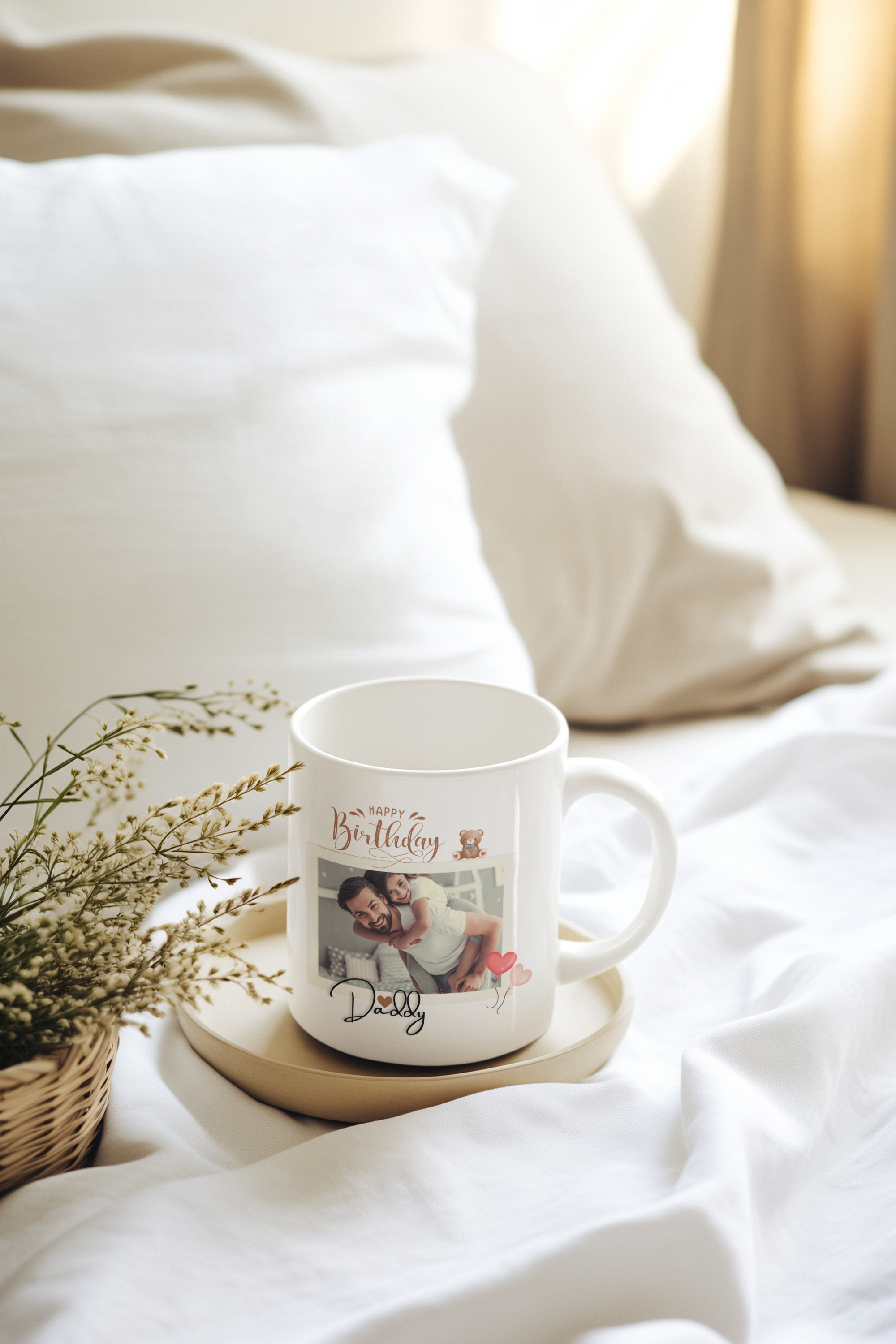 Celebrate Dad’s special day with a custom ceramic photo mug that turns every sip into a memory. Featuring warm photos and soft watercolor hearts wrapped around a glossy white surface, this mug blends sentiment with everyday function.