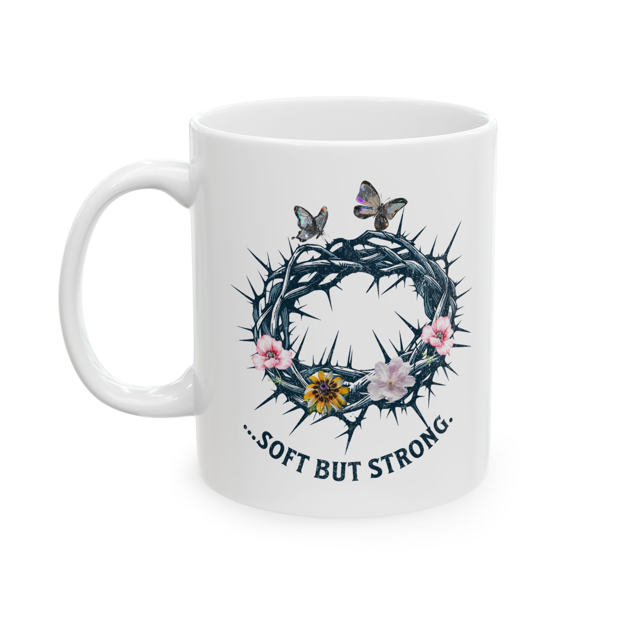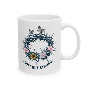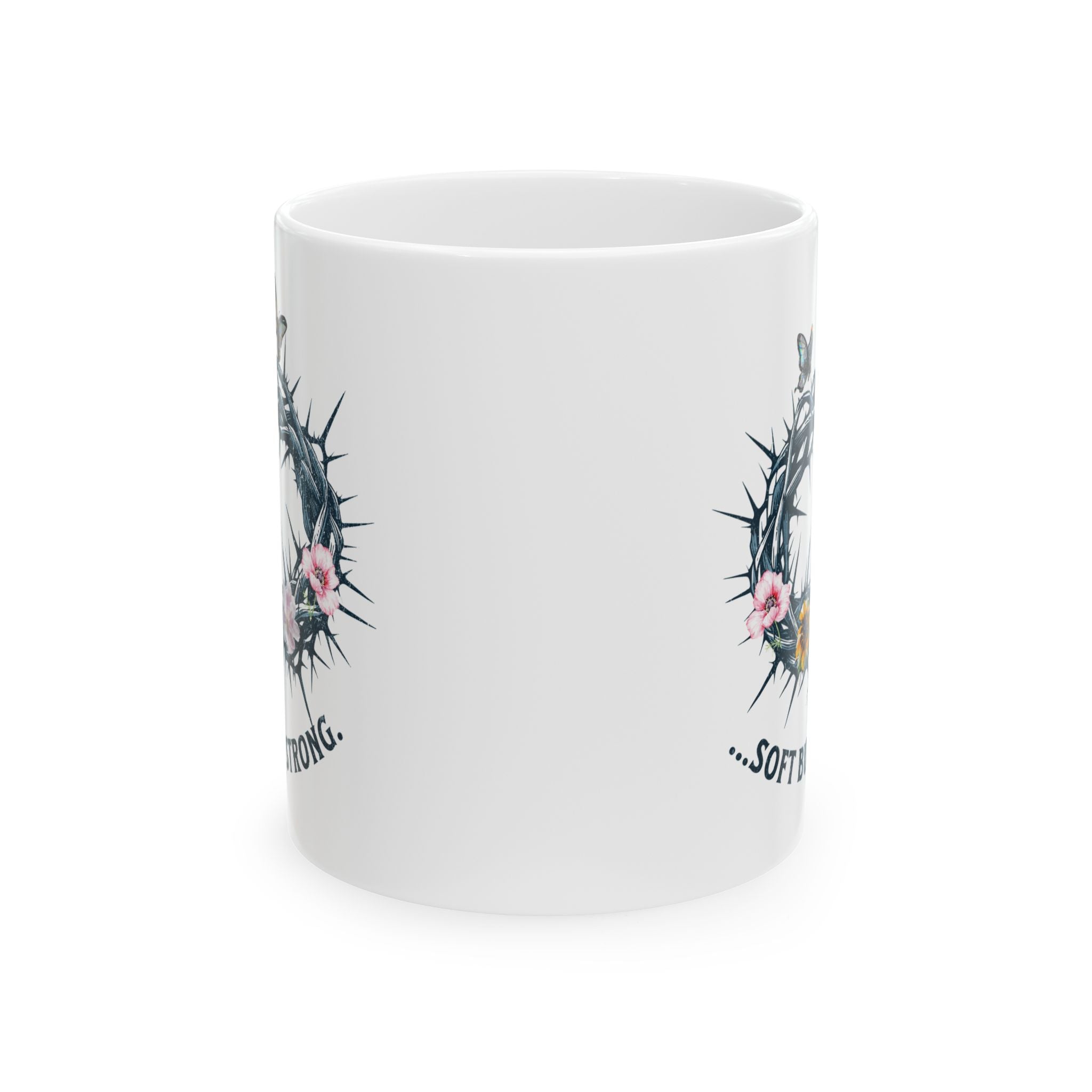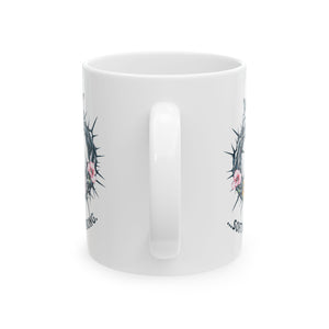 Embrace resilience and beauty with this ceramic mug featuring a crown of thorns and butterflies in flight, paired with a delicate yet powerful phrase that inspires strength and hope. The glossy white surface highlights the symbolic artwork, blending struggle and transformation into a design that feels both meaningful and uplifting.